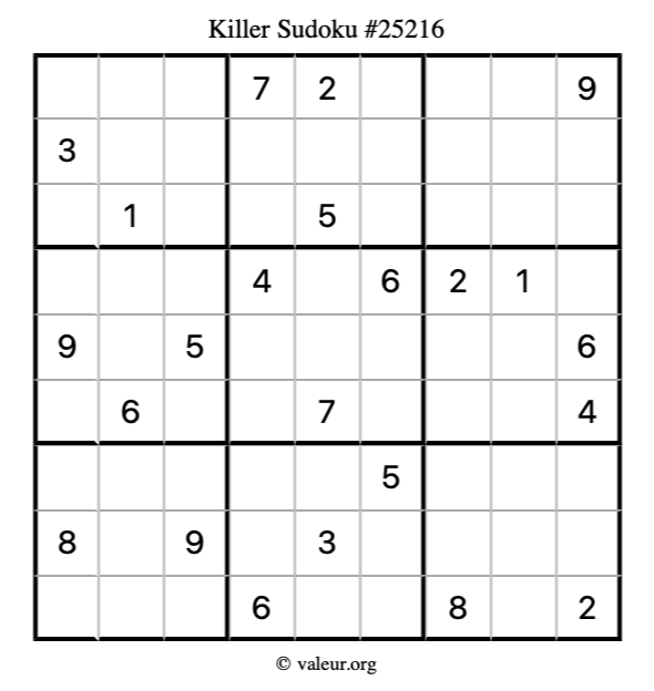 Here is our printable Killer Sudoku Puzzle #25216. You are welcome to print a copy for yourself and solve it the old-fashioned way with a pencil and an eraser!
