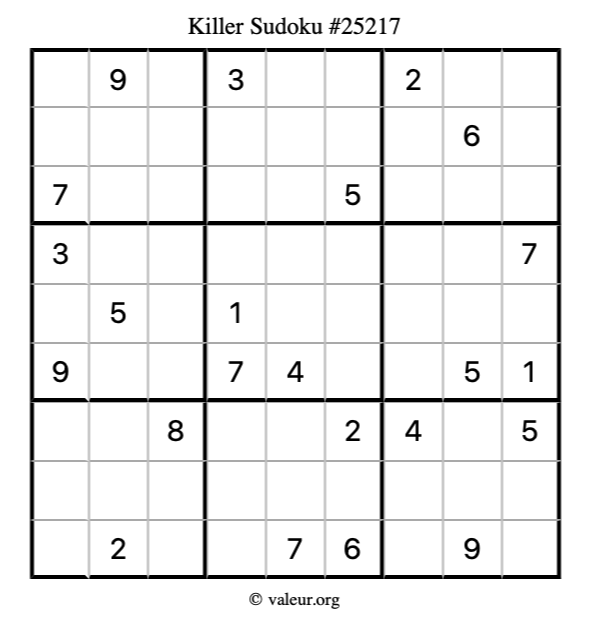 Here is our printable Killer Sudoku Puzzle #25217. You are welcome to print a copy for yourself and solve it the old-fashioned way with a pencil and an eraser!