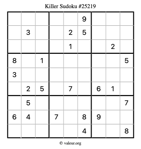 Here is our printable Killer Sudoku Puzzle #25219. You are welcome to print a copy for yourself and solve it the old-fashioned way with a pencil and an eraser!