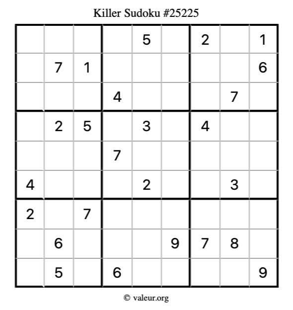 Killer Sudoku puzzle #25225 is not the only killer Sudoku puzzle in our database. We have thousands of killer Sudoku puzzles that you can print and solve. Check them out here!