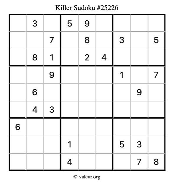 Here is our printable Killer Sudoku Puzzle #25226. You are welcome to print a copy for yourself and solve it the old-fashioned way with a pencil and an eraser!