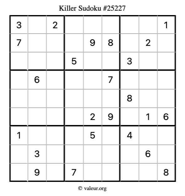 Here is our printable Killer Sudoku Puzzle #25227. You are welcome to print a copy for yourself and solve it the old-fashioned way with a pencil and an eraser!
