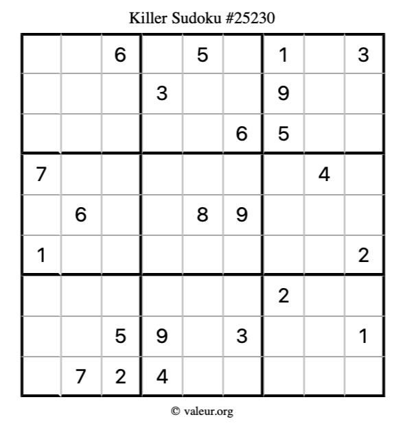 Here is our printable Killer Sudoku Puzzle #25230. You are welcome to print a copy for yourself and solve it the old-fashioned way with a pencil and an eraser!