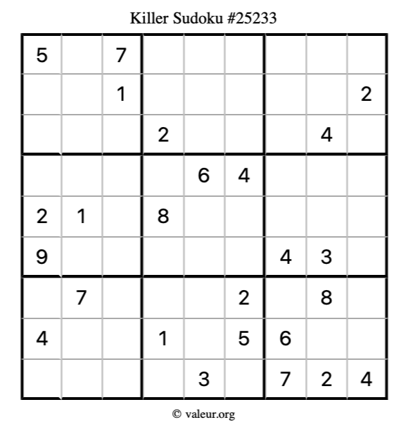 Here is our printable Killer Sudoku Puzzle #25233. You are welcome to print a copy for yourself and solve it the old-fashioned way with a pencil and an eraser!