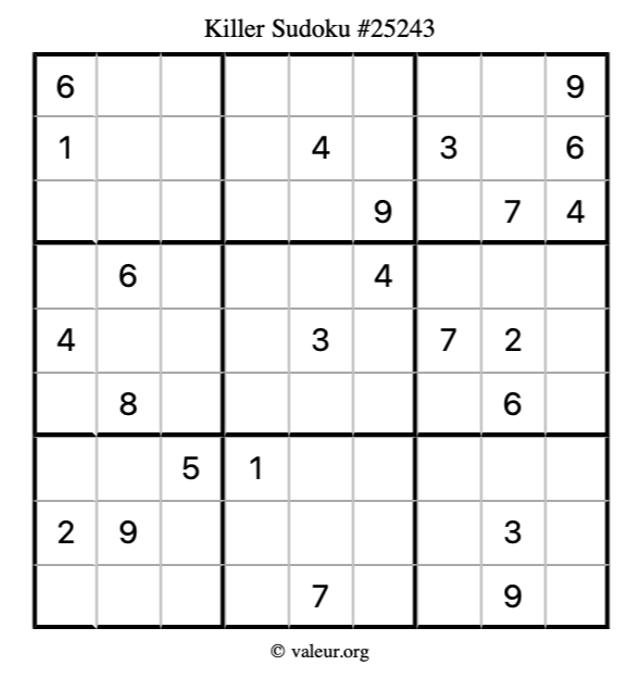 Here is our printable Killer Sudoku Puzzle #25243. You are welcome to print a copy for yourself and solve it the old-fashioned way with a pencil and an eraser!