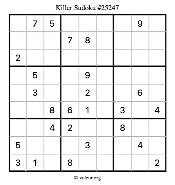 Here is our printable Killer Sudoku Puzzle #25247. You are welcome to print a copy for yourself and solve it the old-fashioned way with a pencil and an eraser!