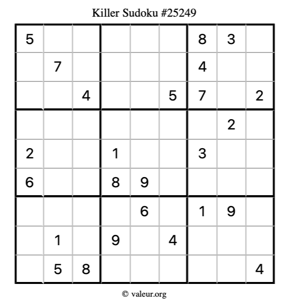 Here is our printable Killer Sudoku Puzzle #25249. You are welcome to print a copy for yourself and solve it the old-fashioned way with a pencil and an eraser!