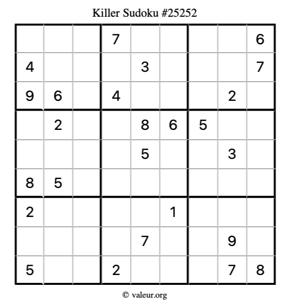 Here is our printable Killer Sudoku Puzzle #25252. You are welcome to print a copy for yourself and solve it the old-fashioned way with a pencil and an eraser!