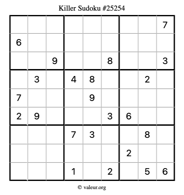 Here is our printable Killer Sudoku Puzzle #25254. You are welcome to print a copy for yourself and solve it the old-fashioned way with a pencil and an eraser!