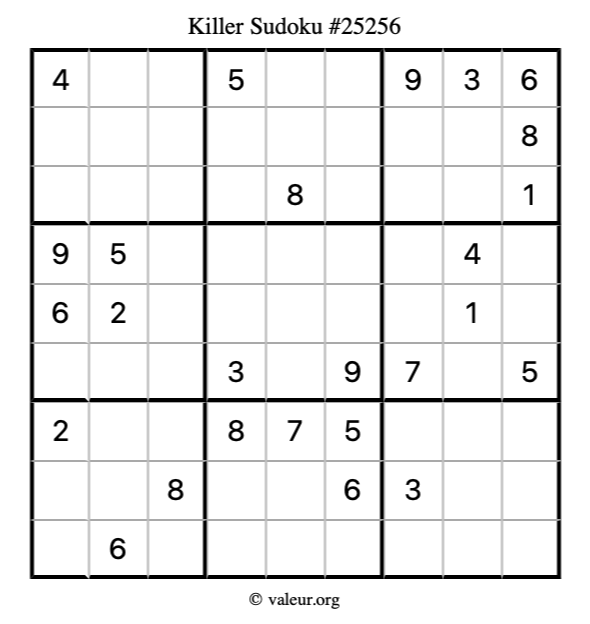 Here is our printable Killer Sudoku Puzzle #25256. You are welcome to print a copy for yourself and solve it the old-fashioned way with a pencil and an eraser!