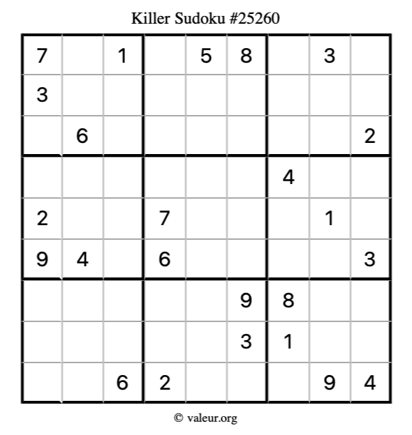 Here is our printable Killer Sudoku Puzzle #25260. You are welcome to print a copy for yourself and solve it the old-fashioned way with a pencil and an eraser!
