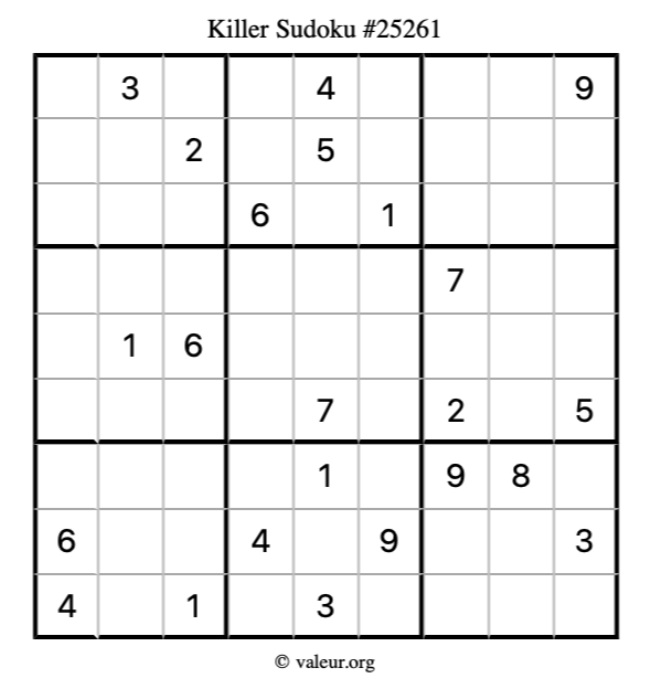 Here is our printable Killer Sudoku Puzzle #25261. You are welcome to print a copy for yourself and solve it the old-fashioned way with a pencil and an eraser!