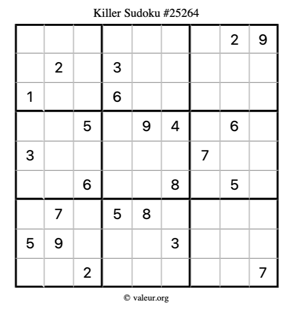 Here is our printable Killer Sudoku Puzzle #25264. You are welcome to print a copy for yourself and solve it the old-fashioned way with a pencil and an eraser!