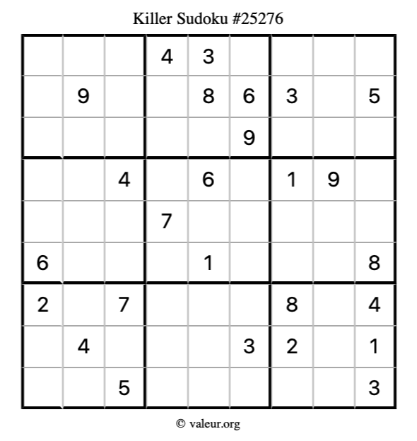 Here is our printable Killer Sudoku Puzzle #25276. You are welcome to print a copy for yourself and solve it the old-fashioned way with a pencil and an eraser!