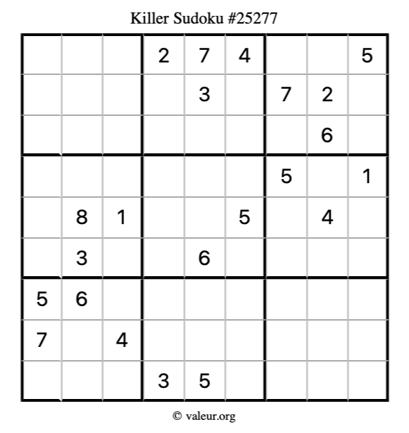 Killer Sudoku puzzle #25277 is not the only killer Sudoku puzzle in our database. We have thousands of killer Sudoku puzzles that you can print and solve. Check them out here!