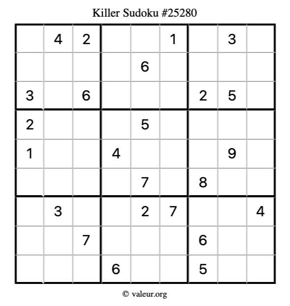 Killer Sudoku puzzle #25280 is not the only killer Sudoku puzzle in our database. We have thousands of killer Sudoku puzzles that you can print and solve. Check them out here!