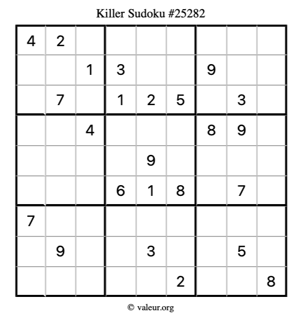 Here is our printable Killer Sudoku Puzzle #25282. You are welcome to print a copy for yourself and solve it the old-fashioned way with a pencil and an eraser!