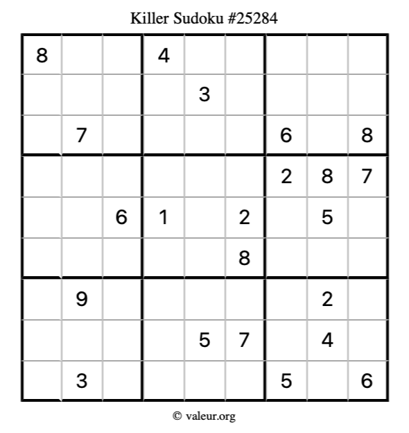 Here is our printable Killer Sudoku Puzzle #25284. You are welcome to print a copy for yourself and solve it the old-fashioned way with a pencil and an eraser!