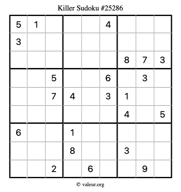 Here is our printable Killer Sudoku Puzzle #25286. You are welcome to print a copy for yourself and solve it the old-fashioned way with a pencil and an eraser!