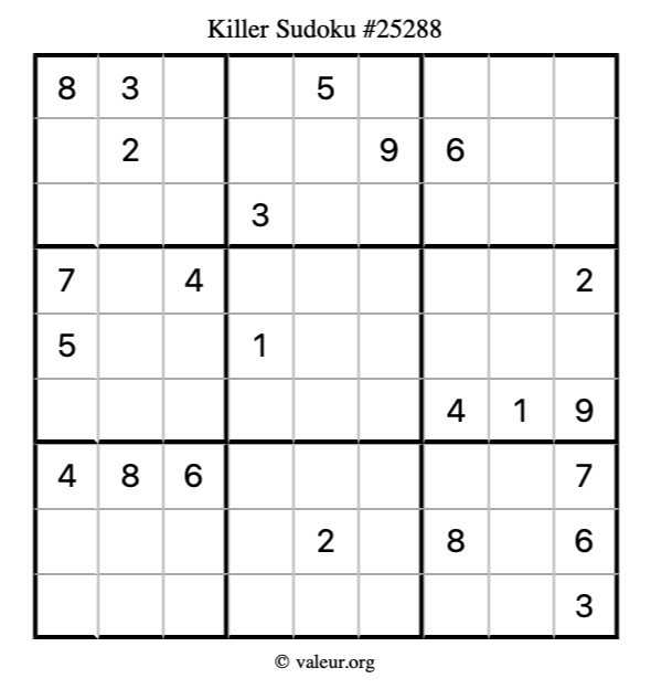 Here is our printable Killer Sudoku Puzzle #25288. You are welcome to print a copy for yourself and solve it the old-fashioned way with a pencil and an eraser!