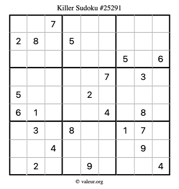 Here is our printable Killer Sudoku Puzzle #25291. You are welcome to print a copy for yourself and solve it the old-fashioned way with a pencil and an eraser!