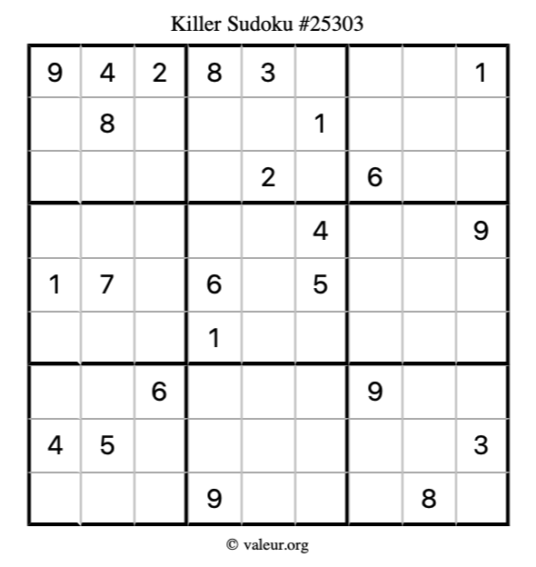 Killer Sudoku puzzle #25303 is not the only killer Sudoku puzzle in our database. We have thousands of killer Sudoku puzzles that you can print and solve. Check them out here!