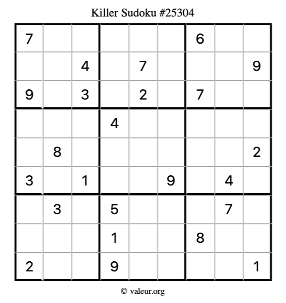 Here is our printable Killer Sudoku Puzzle #25304. You are welcome to print a copy for yourself and solve it the old-fashioned way with a pencil and an eraser!
