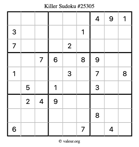 Killer Sudoku puzzle #25305 is not the only killer Sudoku puzzle in our database. We have thousands of killer Sudoku puzzles that you can print and solve. Check them out here!