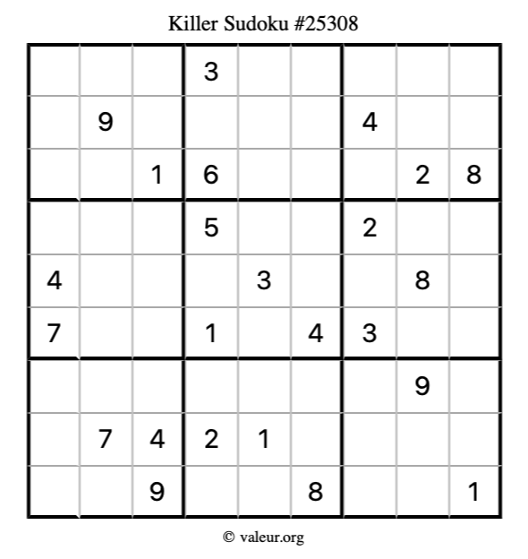 Killer Sudoku puzzle #25308 is not the only killer Sudoku puzzle in our database. We have thousands of killer Sudoku puzzles that you can print and solve. Check them out here!