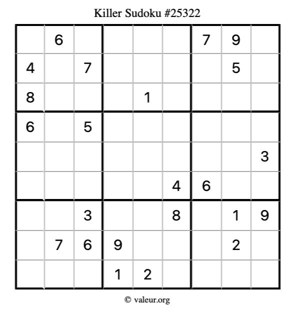 Here is our printable Killer Sudoku Puzzle #25322. You are welcome to print a copy for yourself and solve it the old-fashioned way with a pencil and an eraser!