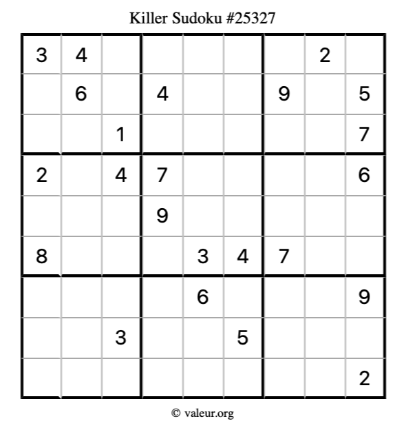Here is our printable Killer Sudoku Puzzle #25327. You are welcome to print a copy for yourself and solve it the old-fashioned way with a pencil and an eraser!