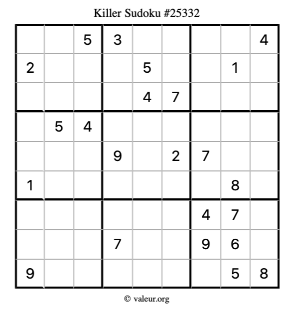 Here is our printable Killer Sudoku Puzzle #25332. You are welcome to print a copy for yourself and solve it the old-fashioned way with a pencil and an eraser!