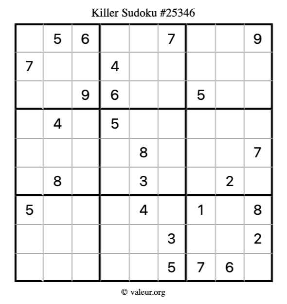 Here is our printable Killer Sudoku Puzzle #25346. You are welcome to print a copy for yourself and solve it the old-fashioned way with a pencil and an eraser!