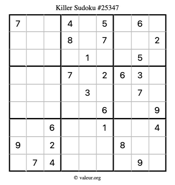 Here is our printable Killer Sudoku Puzzle #25347. You are welcome to print a copy for yourself and solve it the old-fashioned way with a pencil and an eraser!