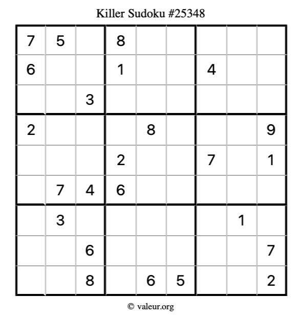 Here is our printable Killer Sudoku Puzzle #25348. You are welcome to print a copy for yourself and solve it the old-fashioned way with a pencil and an eraser!