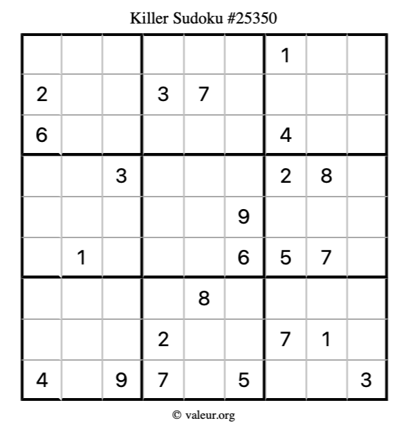 Killer Sudoku puzzle #25350 is not the only killer Sudoku puzzle in our database. We have thousands of killer Sudoku puzzles that you can print and solve. Check them out here!
