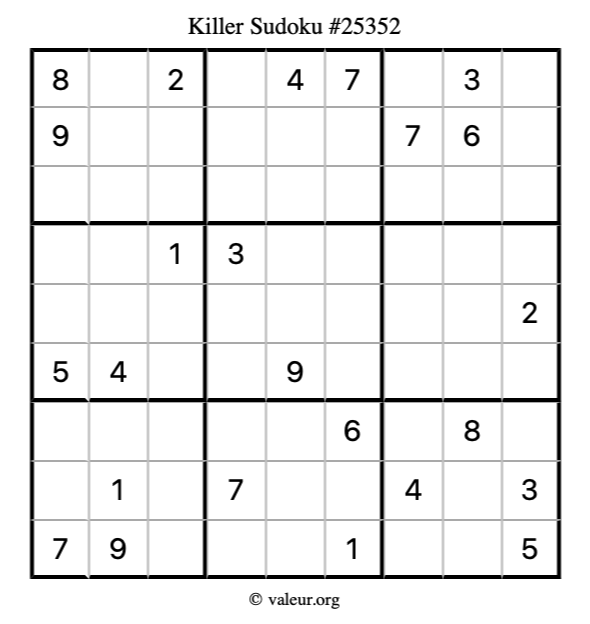 Here is our printable Killer Sudoku Puzzle #25352. You are welcome to print a copy for yourself and solve it the old-fashioned way with a pencil and an eraser!