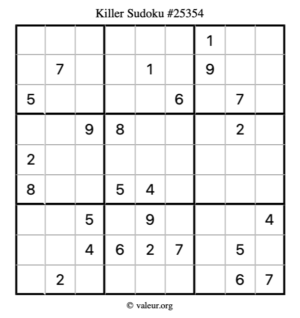 Here is our printable Killer Sudoku Puzzle #25354. You are welcome to print a copy for yourself and solve it the old-fashioned way with a pencil and an eraser!
