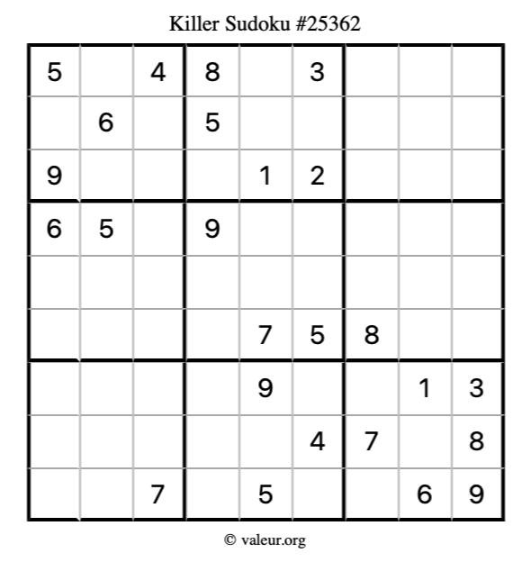Here is our printable Killer Sudoku Puzzle #25362. You are welcome to print a copy for yourself and solve it the old-fashioned way with a pencil and an eraser!