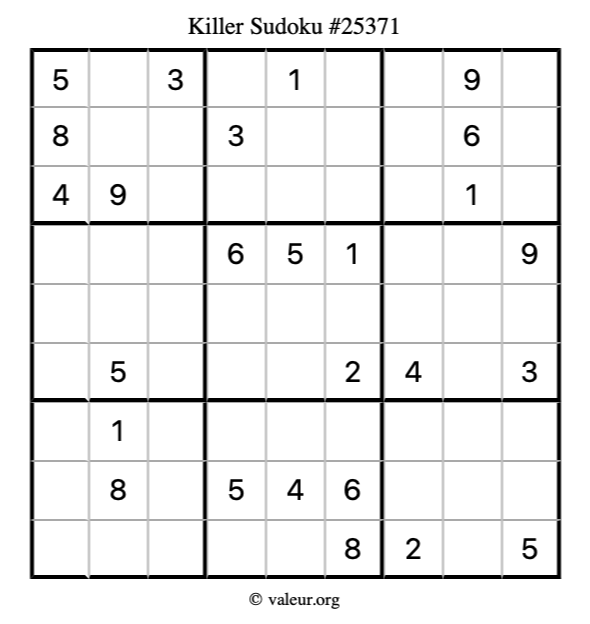 Here is our printable Killer Sudoku Puzzle #25371. You are welcome to print a copy for yourself and solve it the old-fashioned way with a pencil and an eraser!