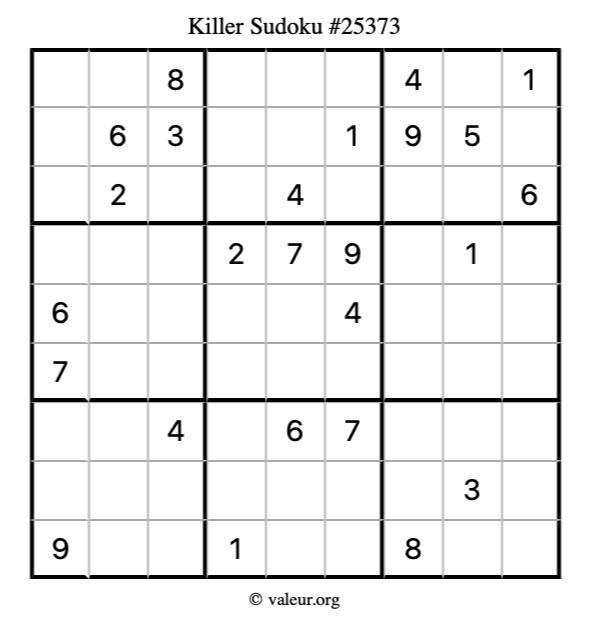 Killer Sudoku puzzle #25373 is not the only killer Sudoku puzzle in our database. We have thousands of killer Sudoku puzzles that you can print and solve. Check them out here!