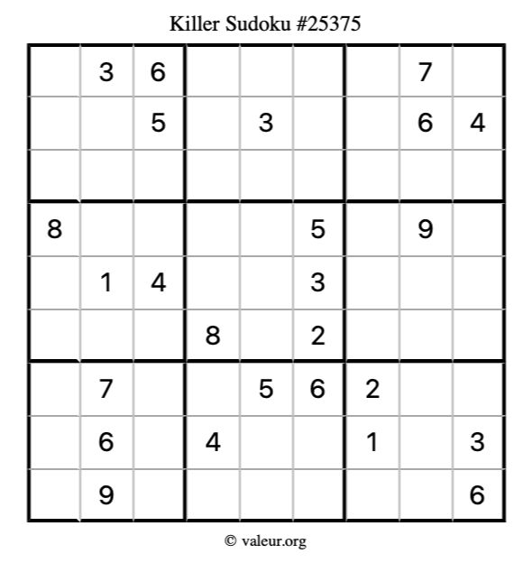 Here is our printable Killer Sudoku Puzzle #25375. You are welcome to print a copy for yourself and solve it the old-fashioned way with a pencil and an eraser!