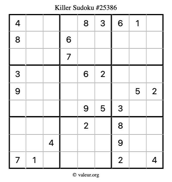 Here is our printable Killer Sudoku Puzzle #25386. You are welcome to print a copy for yourself and solve it the old-fashioned way with a pencil and an eraser!