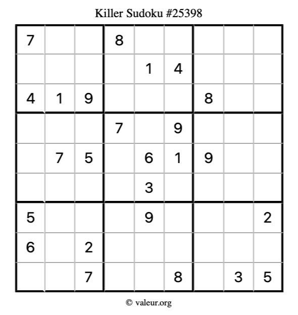 Here is our printable Killer Sudoku Puzzle #25398. You are welcome to print a copy for yourself and solve it the old-fashioned way with a pencil and an eraser!