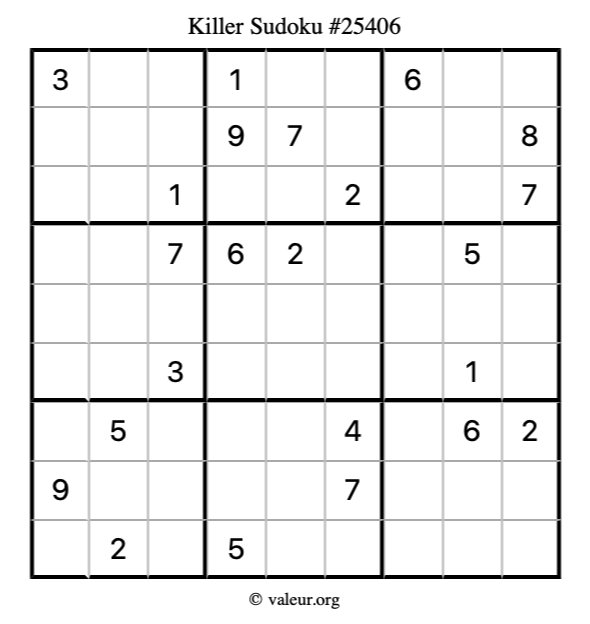 Here is our printable Killer Sudoku Puzzle #25406. You are welcome to print a copy for yourself and solve it the old-fashioned way with a pencil and an eraser!