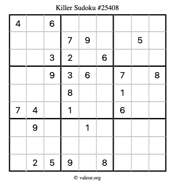 Here is our printable Killer Sudoku Puzzle #25408. You are welcome to print a copy for yourself and solve it the old-fashioned way with a pencil and an eraser!
