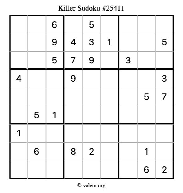 Here is our printable Killer Sudoku Puzzle #25411. You are welcome to print a copy for yourself and solve it the old-fashioned way with a pencil and an eraser!