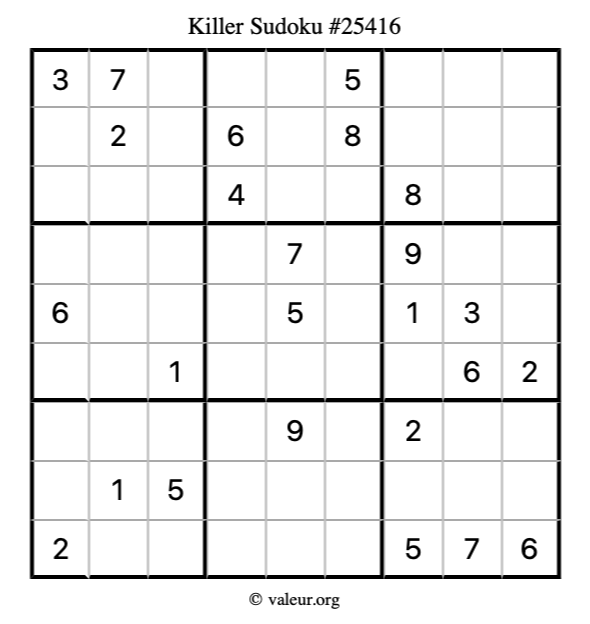 Here is our printable Killer Sudoku Puzzle #25416. You are welcome to print a copy for yourself and solve it the old-fashioned way with a pencil and an eraser!