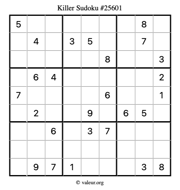 Here is our printable Killer Sudoku Puzzle #25601. You are welcome to print a copy for yourself and solve it the old-fashioned way with a pencil and an eraser!