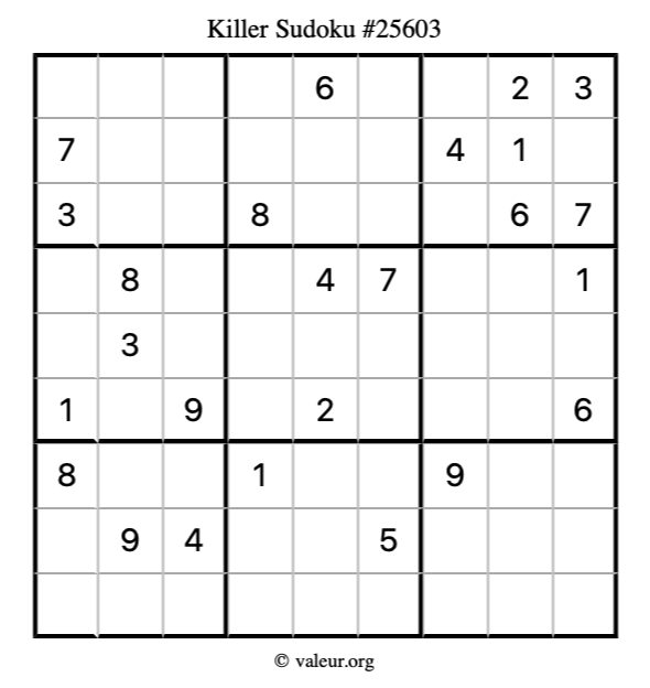 Here is our printable Killer Sudoku Puzzle #25603. You are welcome to print a copy for yourself and solve it the old-fashioned way with a pencil and an eraser!